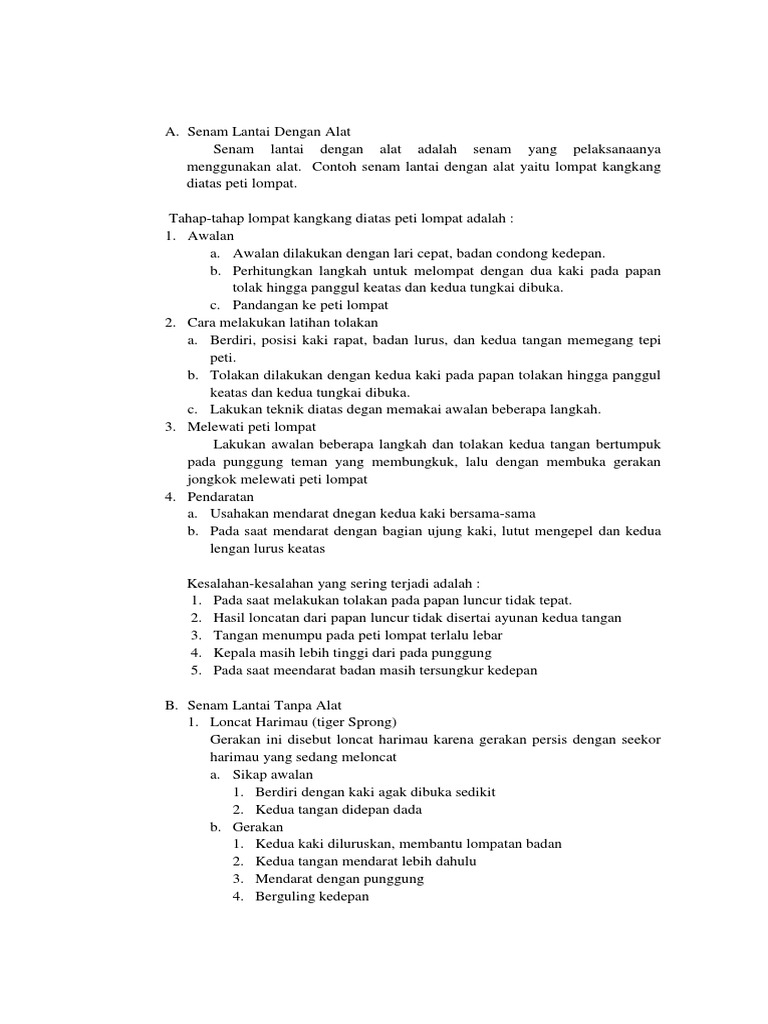 Ke delapan belas point tersebut mulai dari pengertian senam lantai sejarah gerakan jenis jenis manfaat dan tujuan sampai dengan gerakan dasar senam lantai. Senam lantai flour exercise adalah satu bagian dari rumpun senam sesuai dengan denga istilah lantai maka gerakan gerakan senam yang dilakukan di atas yang beralasan matras atau permadani atau sering juga disebut dengan istilah latihan bebassebab pada waktu melakukan gerakan atau latihannya.