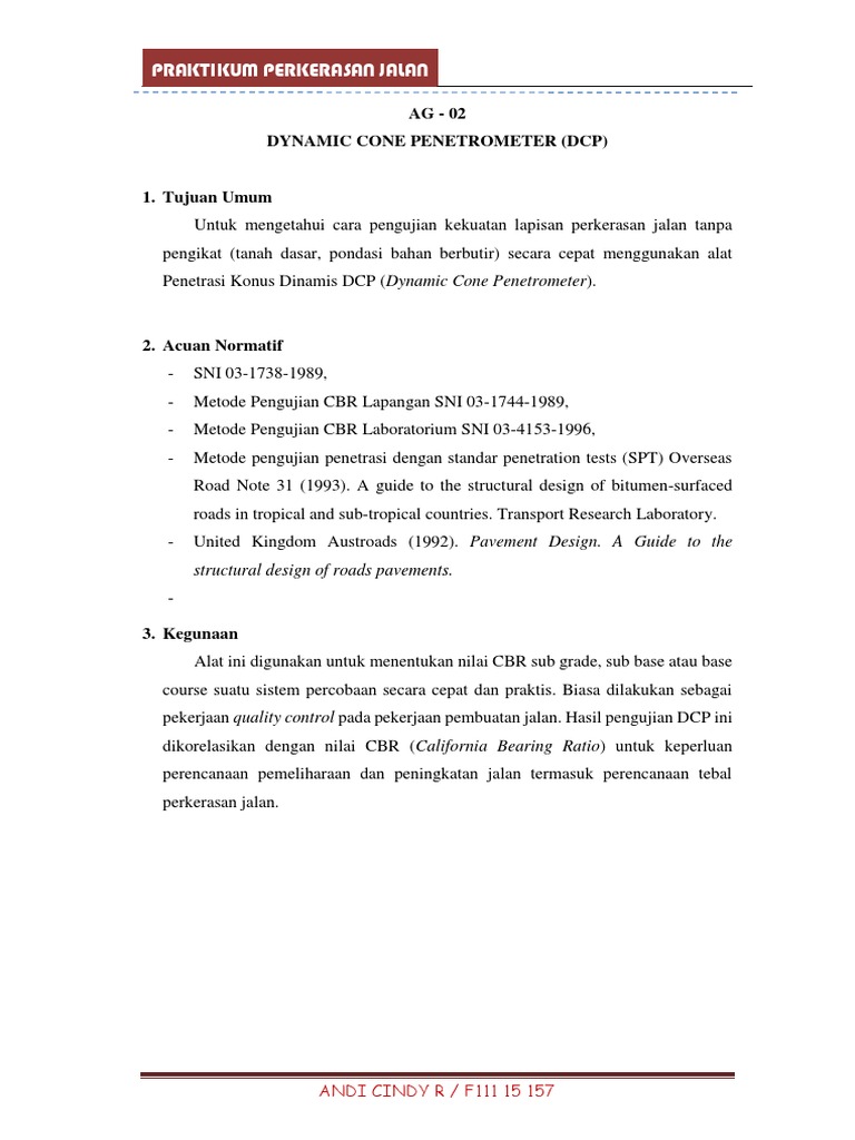 363 prosedur pemeriksaan 1. Untuk memperkirakan nilai cbr tanah atau bahan granular dapat menggunakan beberapa metode namun yang cukup akurat dan paling murah sampai saat ini adalah dengan alat penetrasi konus dinamis atau dikenal dengan nama dynamic cone penetrometer dcpdi samping itu dcp adalah salah satu cara pengujian tanpa merusak atau non destructive testing ndt yang digunakan untuk lapis pondasi batu pecah.