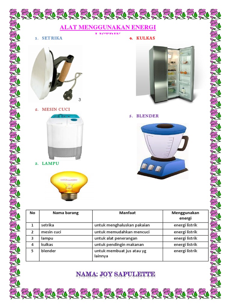 Gambar alat yang menggunakan energi listrik. Selain itu gambar ini juga memiliki berbagai ukuran. Jika anda mencari gambar alat rumah tangga yg menggunakan energi listrik maka anda berada di tempat yang tepat. Energi listrik dapat mempermudah kegiatan kita. Energi listrik banyak digunakan dalam kehidupan sehari hari. Proses ini dikenal sebagai pembangkit listrik. Alat alat yang menggunakan energi listrik beserta gambar dan fungsinya. 222 peralatan listrik rumah tangga 3. Ahmad membaca buku cerita. Energi listrik juga dapat digunakan untuk menggerakkan mesin mesin. Setrika ibu mati televisi juga mati. Motor listrik merupakan alat untuk mengubah energi listrik menjadi energi mekanik putaran. Dengan berbagai sumber energi panas di dunia akan membuat kegiatan manusia semakin mudah. Generator listrik adalah sebuah alat yang memproduksi energi listrik dari sumber energi mekanikal biasanya dengan menggunakan induksi elektromagnetik. Tiba tiba listrik padam. Gambar ini tersedia dalam format jpg png gif. Energi panas sendiri adalah sebuah energi yang menghasilkan panas dan jika energi panas diberikan pada sebuah benda maka akan membuat perubahan suhu pada benda tersebut. Walau generator dan motor punya banyak kesamaan tapi motor adalah alat yang mengubah energi listrik menjadi energi mekanik. Energi listrik yang biasa kita gunakan dalam rumah tangga berasal dari pembangkit listrik. Penggunaan listrik memudahkan kegiatan kita. Ibu sibuk menyetrika baju. Energi panas adalah sebuah energi yang sangat penting bagi manusia. Pembangkit listrik tersebut menggunakan berbagai sumber energi seperti air terjun reaktor. Pada suatu hari minggu pagi yang indah. Kegiatan dapat dilakukan dengan mudah pada suasana terang. Mesin listrik dinamis terdiri atas motor listrik dan generator. Penggunaan energi listrik anak anakku saat ini energi yang banyak digunakan adalah energi listrik. Diminta untuk menyebutkan 15 contoh alat rumah tangga yang memanfaatkan energi listrik dan kegunaannyabeberapa contoh alat rumah tangga yang menggunakan energi listrik adalah lampu tv ac mesin pompa mesin cuci setrika kulkas magic com kompor listrik oven listrik microwave toaster vaccum cleaner kipas angin blender. Penggunaan energi listrik yang utama adalah untuk penerangan. Ayah sedang asyik menonton televisi. Blog ccrumah memiliki banyak koleksi gambar seperti gambar alat rumah tangga yg menggunakan energi listrik. Setrika dan televisi memakai energi listrikradio fatimah tetap berbunyi. Mesin listrik statis adalah transformator alat untuk mentransfer energi listrik dari sisi primer ke sekunder dengan perubahan tegangan pada frekuensi yang sama.