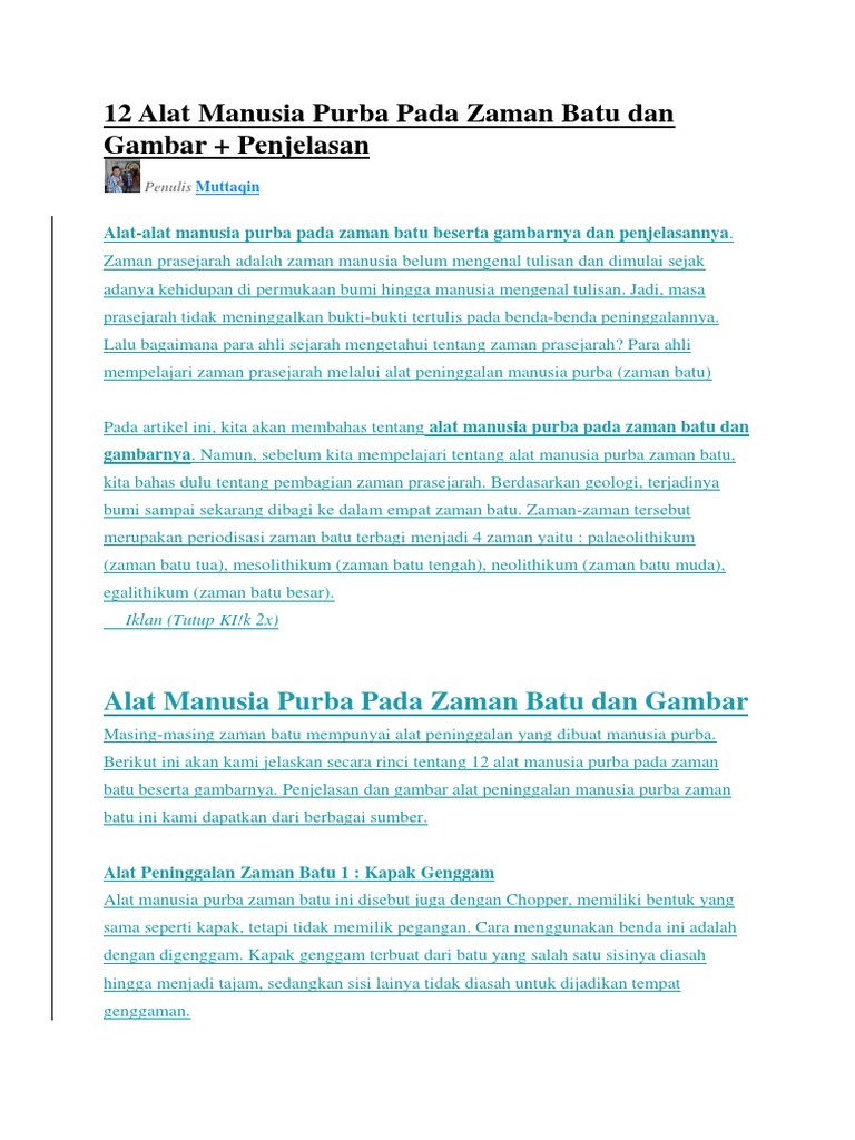 Gambar alat zaman batu. Alat alat zaman paleolithikum. Pada kesempatan ini akan dibahas hasil kebudayaan zaman batu yang dilengkapi dengan gambar. Pada zaman palelithikum ini alat alat yang dihasilkan masih sangat kasar dan sederhana sekali. Maka jangan heran ketika pada zaman ini alat alat yang dihasilkan belum terlalu halus. Zaman batu terjadi sebelum logam dikenal dan alat alat kebudayaan terutama dibuat dari batu di samping kayu dan tulang. Zaman mesolitikum atau zaman batu madya tentu lebih maju dibandingkan zaman paleolitikum. Sesuai dengan namanya bantuk kapak persegi adalah persegi panjang atau berbentuk trapesium. Pada zaman paleolithikum ini alat alat yang mereka hasilkan masih sangat kasar. Bukti bukti kebudayaan zaman batu dapat terlihat dari alat alat yang telah ditemukan. Alat manusia purba pada zaman batu dan gambar masing masing zaman batu mempunyai alat peninggalan yang dibuat manusia purba. Paleolitikum atau zaman batu tua disebut demikian sebab alat alat batu buatan manusia masih dikerjakan secara kasar tidak diasah atau dipolis. Penjelasan dan gambar alat peninggalan manusia purba zaman batu ini kami dapatkan dari berbagai sumber. 13 alat manusia purba di zaman batu dan penjelasan lengkap masa ini disebut zaman batu karena pada masa ini manusia purba menggunakan alat alat yang sebagian besar terbuat dari batu yang digunakan untuk memenuhi kebutuhan hidup mereka. Berikut ini akan kami jelaskan secara rinci tentang 12 alat manusia purba pada zaman batu beserta gambarnya. Di zaman batu tengah ini dipercaya kalau manusia pra sejarah masih menggunakan batu untuk alat sehari hari. Alat alat dari batu pada zaman batu muda ini antara lain kapak persegi dan kapak lonjong. Di melolo sumbawa banyak ditemukan periuk belanga yang ternyata berisi tulang belulang manusia. Walaupun bentuknya hanya berupa pecahan pecahan kecil tetapi sudah dihiasi gambar gambar. Zaman batu tua diperkirakan berlangsung kira kira 600000 tahun yang lalu yaitu selama masa pleistosen diluvium. Pada zaman batu muda ini alat alat dibuat dari batu yang sudah diasah atau dihaluskan. Alat alat yang di gunakan manusia pada zaman batu dan zaman logam zaman batu. Zaman batu tua paleolithikum diperkirakan berlangsung kira kira 600000 tahun yang lalu. Kebudayaan megalitikum merupakan zaman yang dimana alat yang dihasilkan berupa batu besar. Ini karena diperkirakan terjadi pada masa holosen yang terjadi sekitar 10000 tahun lalu. Alat alat peninggalan zaman batu beserta fungsinya bag 1 zaman prasejarah di indonesia terbagi menjadi dua yaitu zaman batu dan zaman logam.