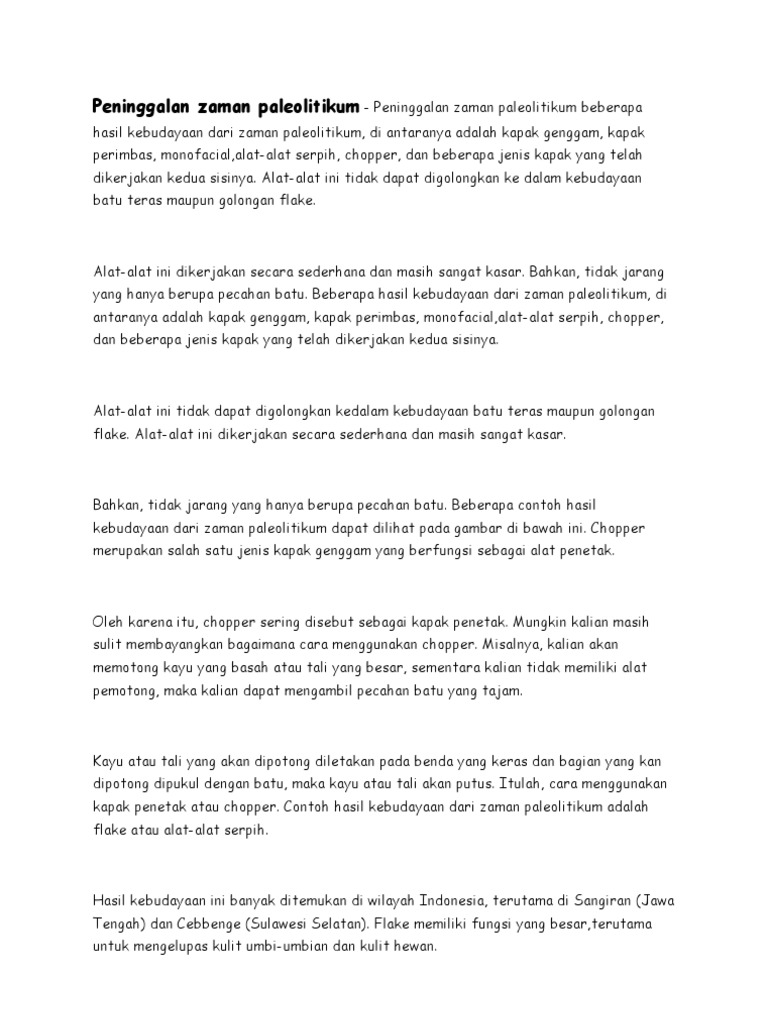 Gambar alat serpih pada zaman paleolitikum. Masa ini manusia masih berpindah pindah dan belum menetap. Ada beberapa alat dan bangunan yang dihasilkan pada zaman kebudayaan megalitikum. Zaman batu tua paleolithikum diperkirakan berlangsung kira kira 600000 tahun yang lalu. Kebanyakan alat dari tulang ini berupa alat penusuk belati dan ujung tombak bergerigi. Di zaman prasejarah hanya ditemukan benda untuk kehidupan sehari hari seperti alat serpih dan lainnya. Kebudayaan ini berkembang bersama dengan kebudayaan logam di indonesia yakni kebudayaan dongson. Ciri ciri zaman paleolitikum. Pada zaman ini belum ditemukan bukti bukti adanya peninggalan yang berupa prasasti atau barang bertulisan lainnya. Maka jangan heran ketika pada zaman ini alat alat yang dihasilkan belum terlalu halus. Alat alat dari tulang ini termasuk hasil kebudayaan ngandong. Pada zaman paleolithikum ini alat alat yang mereka hasilkan masih sangat kasar. Alat serpih yang ditemukan di gua tabon palawan dan gua niah serawak diperkirakan berlangsung sekitar 30 40 ribu tahun yang lalu yakni pada tingkat akhir plestosen. Bahkan tidak jarang yang hanya berupa pecahan batu. Karena alat serpih ini sering kali ditemukan bersama sama dengan kapak perimbas dan kapak genggam maka alat serpih diperkirakan berada pada zaman paleolitikum. Zaman batu paleolitikum mesolitikum neolitikum dan megalitikum. Zaman paleolitikum paleolitikum terdiri dari dua kata yaitu kata paleos yang mempunyai arti batu dan kata litikum yang berasal dari kata litos yang mempunyai arti tua maka biasa juga zaman paleolitikum disebut dengan zaman batu tua. Fungsi dari alat ini adalah untuk mengorek ubi dan keladi dari dalam tanah. Manusia purba yang tinggal pada masa paleolitikum adalah manusia jenis pithecanthropus erectus manusia yang berjalan tegak. Salah satu alat peninggalan zaman paleolitikum yaitu alat dari tulang binatang. Zaman paleolitikum memiliki ciri ciri sebagai berikut ini. Beberapa contoh hasil kebudayaan dari zaman paleolitikum dapat dilihat pada gambar di bawah ini. Zaman batu tua diperkirakan berlangsung kira kira 600000 tahun yang lalu yaitu selama masa pleistosen diluvium. Diperkirakan zaman batu tua berlangsung pada masa pleistosen awal yaitu kira kira pada enam ratus ribu tahun yang lalu. Contoh hasil kebudayaan dari zaman paleolitikum adalah flake atau alat alat serpih. Mereka hidup secara berkelompok dan menggunkan alat alat yang terbuat dari batu kasar. Alat alat ini dikerjakan secara sederhana dan masih sangat kasar. Pada zaman palelithikum ini alat alat yang dihasilkan masih sangat kasar dan sederhana sekali. Pada zaman batu tengah kehidupan manusia purba banyak dihabiskan di dalam gua yang disebut abri sous roche. Peninggalan di zaman ini ialah kapak perimbas monofacialalat alat serpih dan chopper.